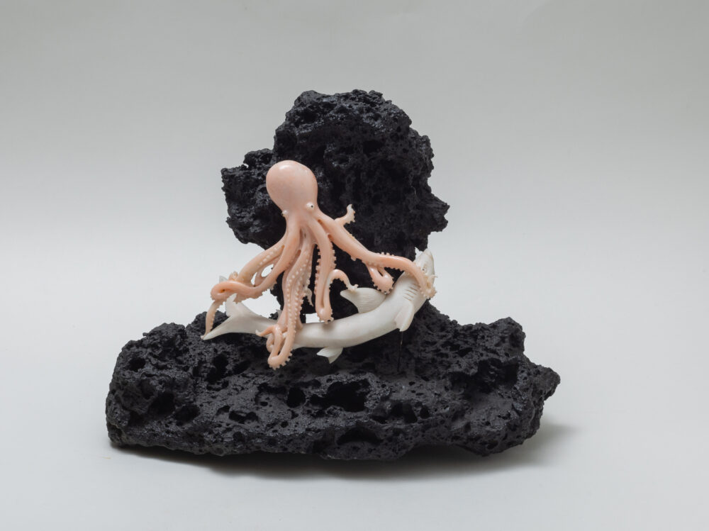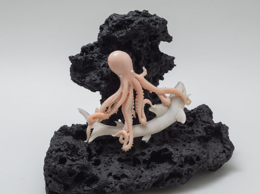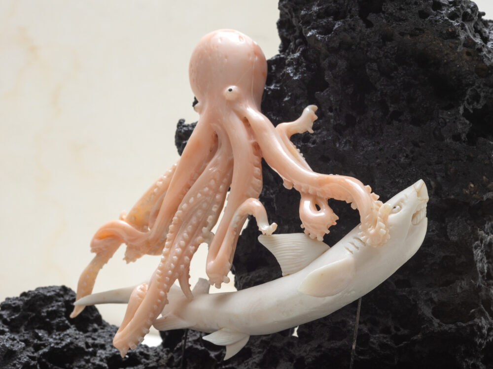 海で最も獰猛といわれるサメと巨大なタコの死闘を珊瑚で表現しました